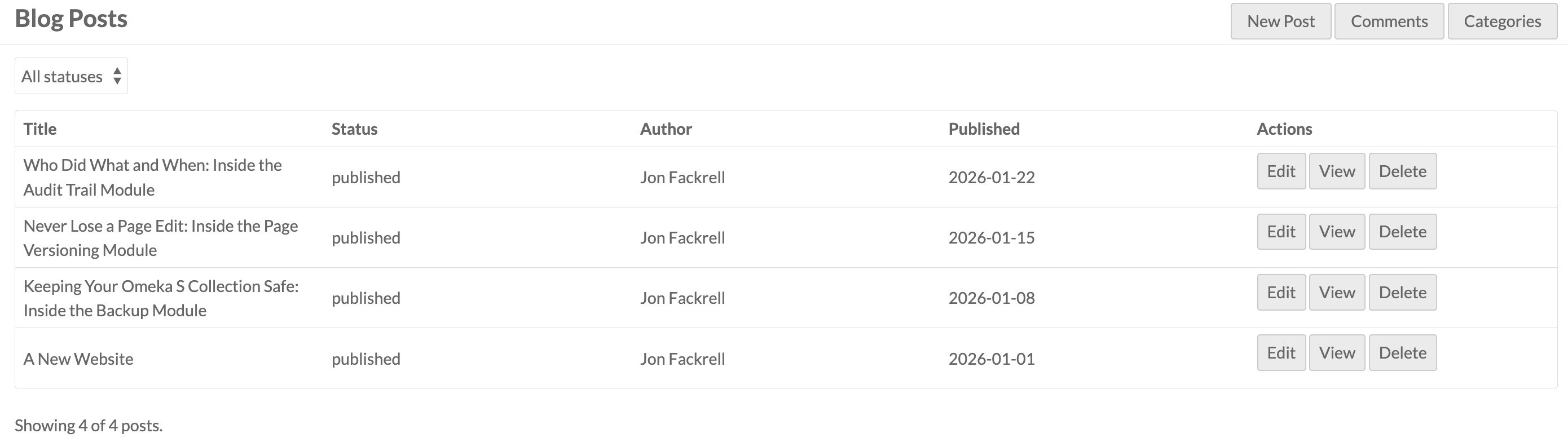 I originally created this module to power my own portfolio site built on Omeka S. But as I worked on it, it became clear that this wasn’t just about my site. A solid blogging system makes every Omeka S site more useful - for announcements, project updates, research highlights, teaching resources, and ongoing storytelling.