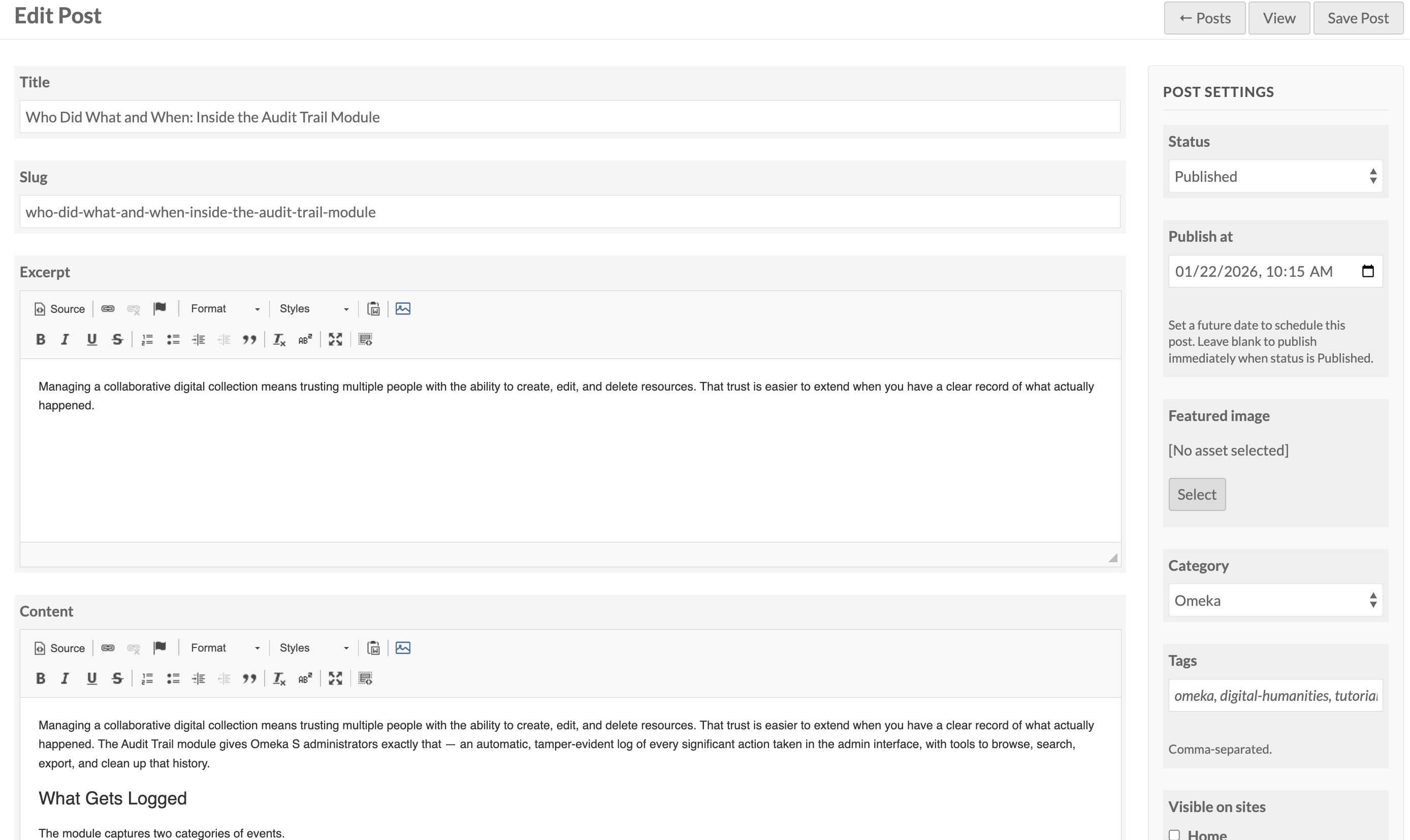 The writing experience is clean and familiar. Posts are created in a two-column editor with CKEditor for rich content. Featured images use Omeka’s built-in Asset library (no separate media system to manage).