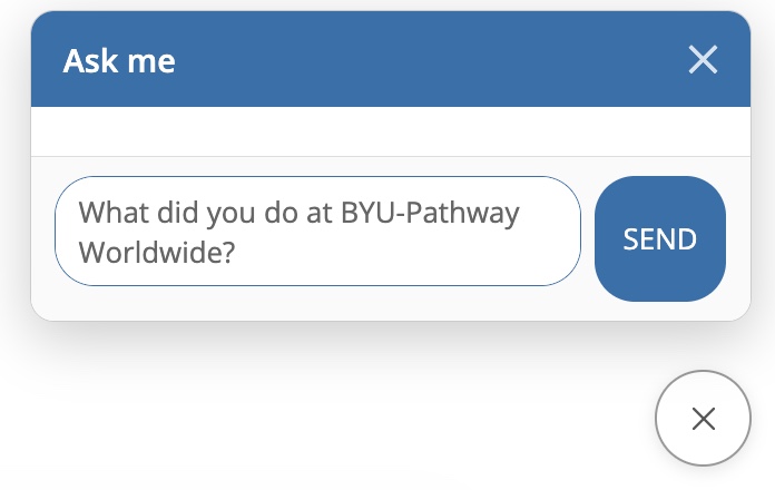 You can try asking, "What did you do at BYU-Pathway Worldwide?" in the chat on the bottom right corner of this page.