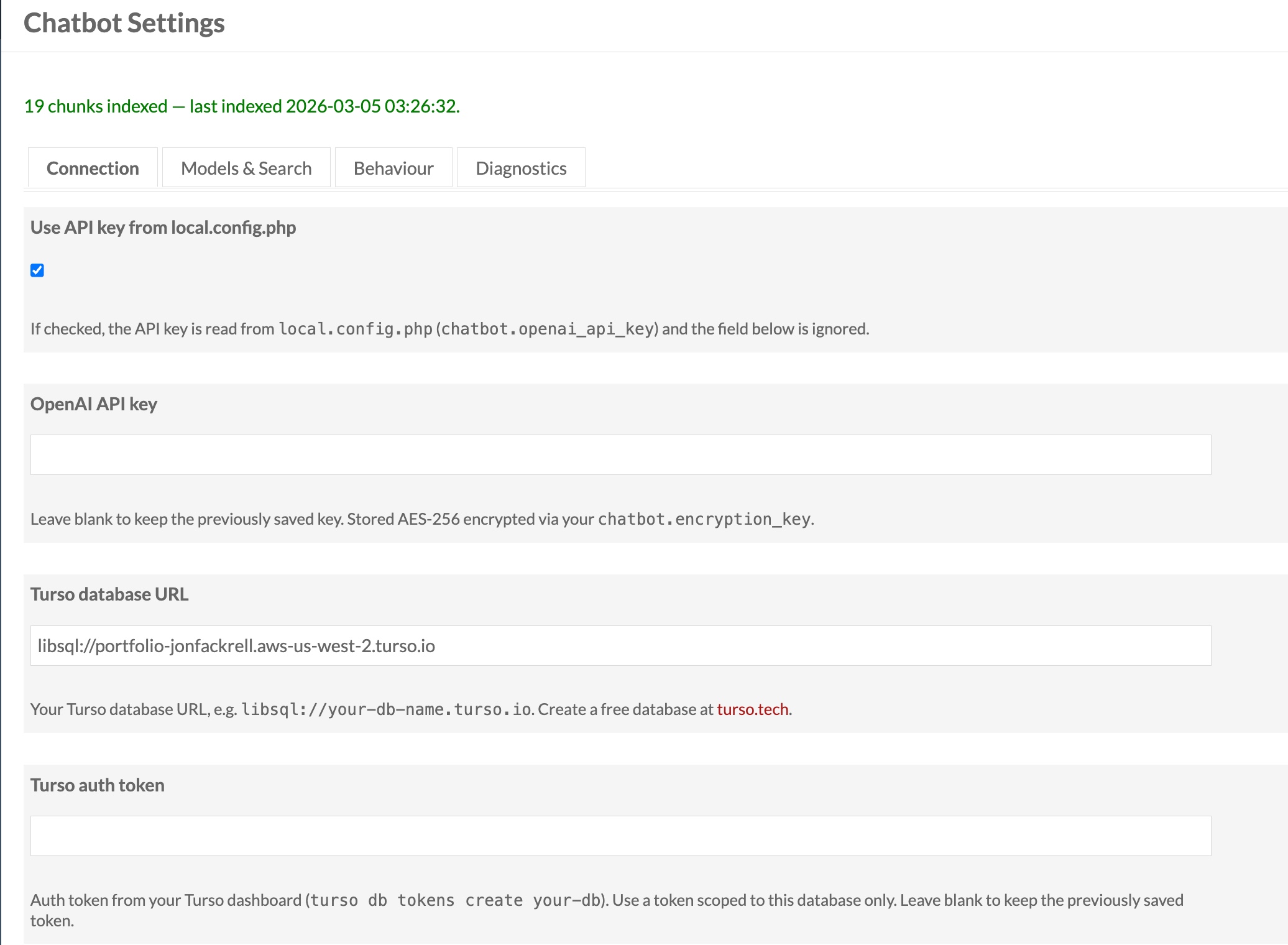 Indexing (happens once, then on each update): Every Omeka S Item's metadata and every Blog Post's content is chunked into overlapping passages (~3,200 characters with 200-character overlap for context continuity). Each chunk is passed through OpenAI's text-embedding-3-large model to produce a 3,072-dimension vector capturing its semantic meaning. Those vectors are stored in a Turso libSQL database with a DISKANN approximate nearest-neighbor index.