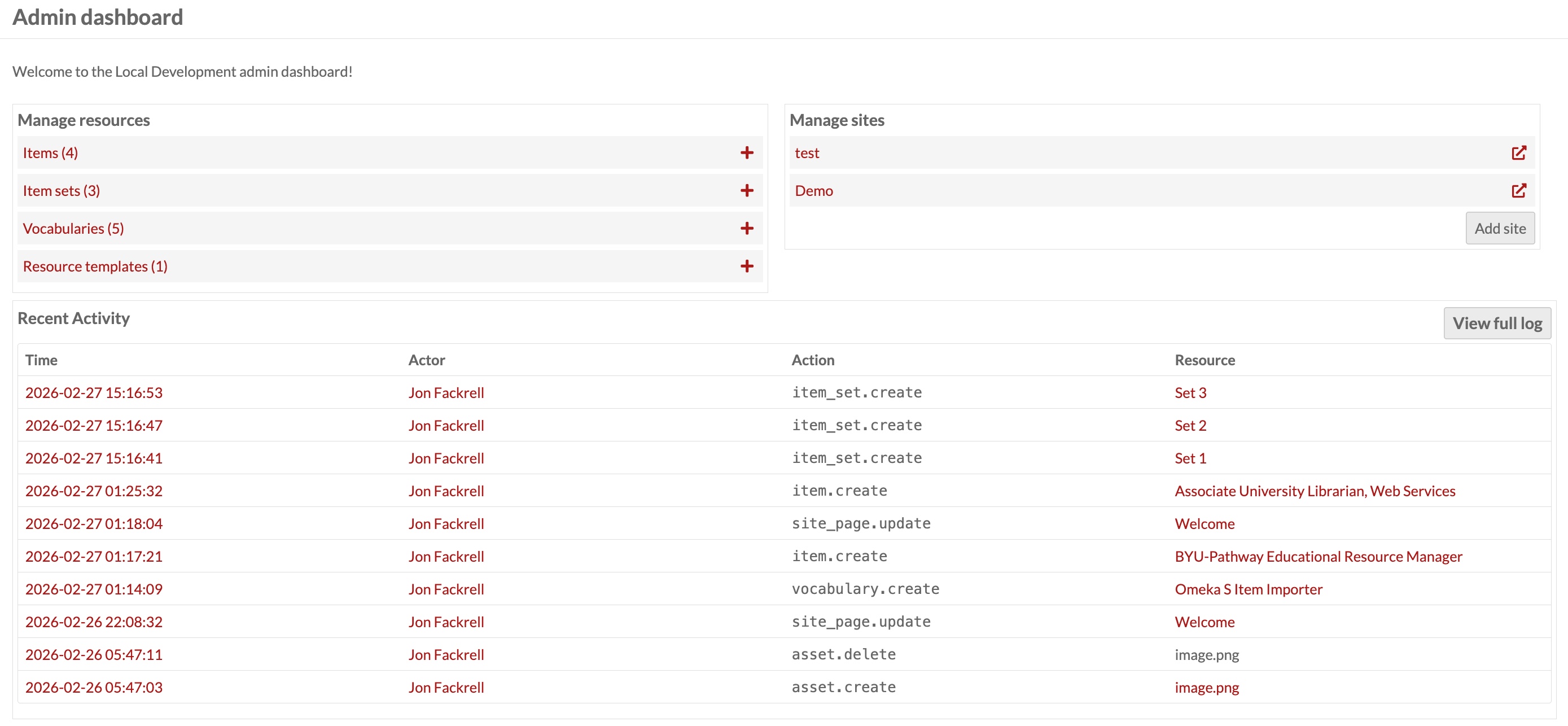 Resource operations — every create, update, and delete on items, item sets, media files, sites, site pages, vocabularies, resource templates, assets, and users. Each entry records the action type (e.g. item.update), the resource's display name, a direct link to its admin page, and the actor who performed it.